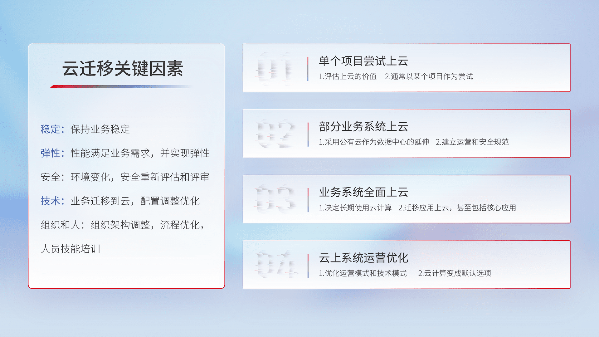 结合实际业务,,从规划设计、、、云平台选型、、、云原生改造、、数据迁移、、、、集成交付,,迁移全过程为客户识别最佳上云路径,,,,做好风险识别管理,,设计网络架构、、身份权限、、、安全审计合规、、操作审计、、日志审计、、、、监控告警策略、、、多站点容灾设计等,,,对云上基础设施进行整体规划,,,,提升IT治理水平,,,,以满足弹性、、、高可用、、高性能的需求。。。。