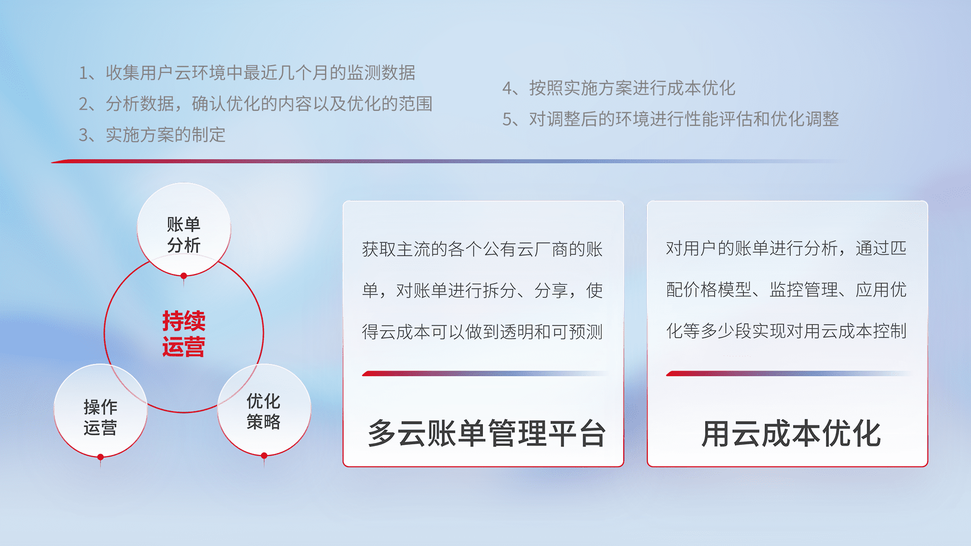 通过多云纳管,,以统一的资源数据模型把客户的云资源进行抽象和封装,,,,进而实现对多云资源的统一操作,,,保障云资源管理的可靠性、、稳定性与可用性。。量身定制化运维内容,,配置、、开发运维、、、补丁管理、、、备份、、监控、、、认证和访问管理、、、、审计和日常巡检等,,,保障在用云过程中的可靠度,,,,稳定度以及高可用率。。。